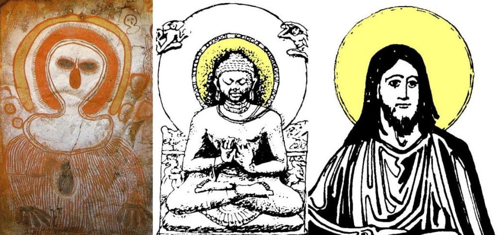 In Australia remote West Kimberleys you can find prehistoric cave paintings (left), many thousands of years old, depicting people with golden halos (photo courtesy G.L.Walsh).